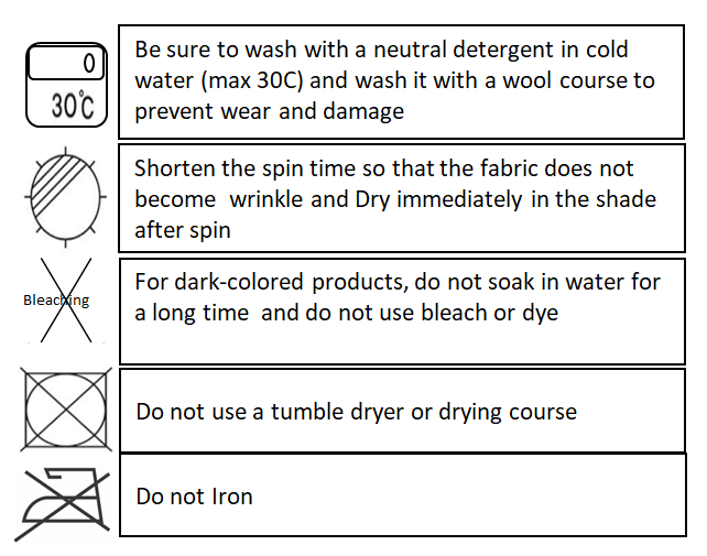 Wash with a neutral detergent in cold water (max 30°C) using a wool cycle to prevent wear and damage.